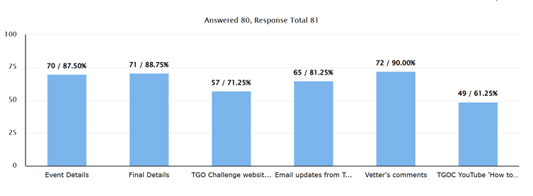 We asked which sources of information supplied by the Coordinators/Vetters was found to most useful? The Event Details, Final Details and Vetter’s Comments all scored highly (around the 90% mark), with the TGO Challenge website dipping to the 70% mark and the TGO YouTube channel just over 60%. We are looking at refreshing the website in the future to try and make it more intuitive; and the TGO YouTube channel has a generally lower hit-rate as it is aimed at the less-experienced Challenger, so is probably less frequented by regular participants. However, even for experienced Challengers, the videos are a useful reminder of how we like the Route Sheet information presented as well as guidance on other topics such as GPX files, using OMN, Grid References etc, and as part of the website refresh exercise, we will look to ensure the links to the You-Tube videos are more clearly signposted.