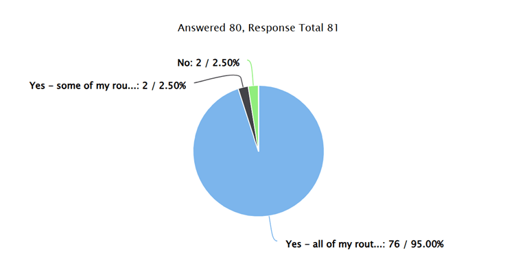 The next few questions revolved around the use of digital mapping in route planning and execution. The results show that 95% of respondents used digital mapping to plot their entire route, with 2.5% using it to plot some of their route, as shown below.