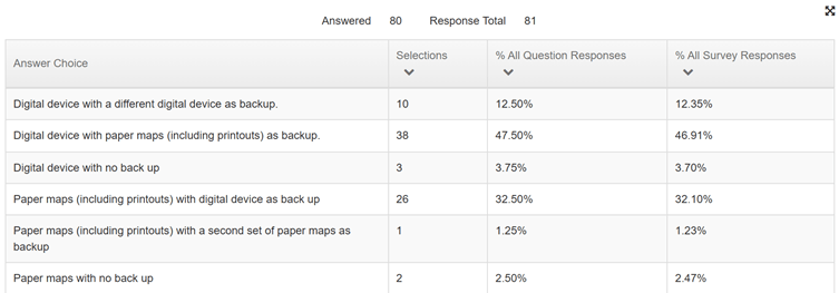 There was a question on which resources were used to plan routes, which had a large and varied response. We had all the usual reference material used, as shown in the table below; however, there were over 30 other resources cited, which are too many to mention here, if you are interested in seeing the list, please request a copy from the coordinators